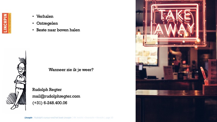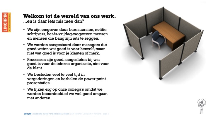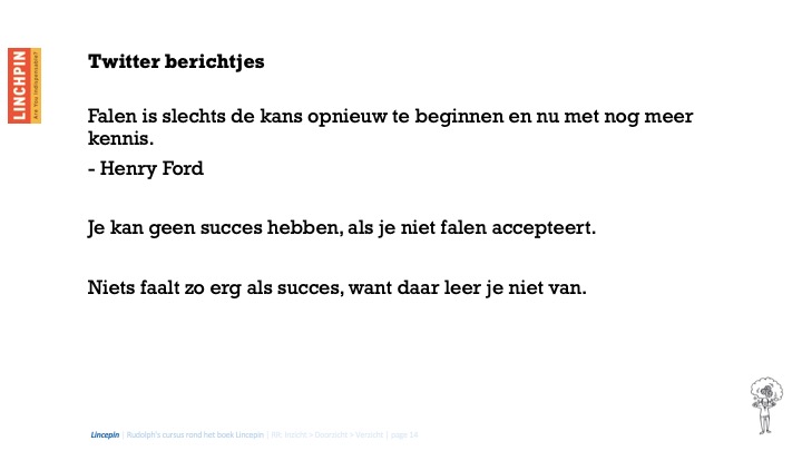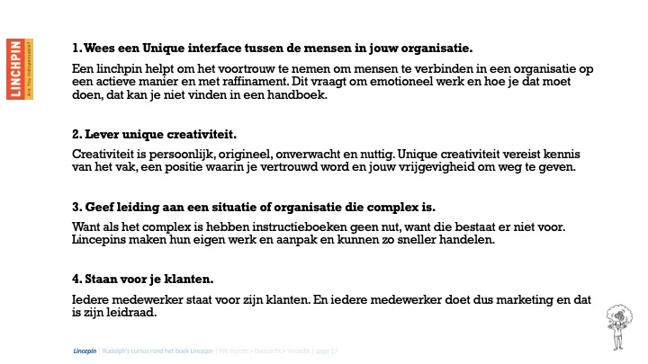 Jawel! In 2012 las ik met medewerkers boeken voor verse input en gingen daar dan elke zoveel tijd mee aan de slag. Zo ook met V, een jonge stagiaire bij de energie en telecom firma. We lazen het boek Lincepin en ze maakte er een cursus/uittreksel van. Nu jaren later gebruik ik er delen van om tijdens trainingen te gebruiken. V is inmiddels highly succesvol in haar privéleven met kids en in haar werk zo hoor ik.