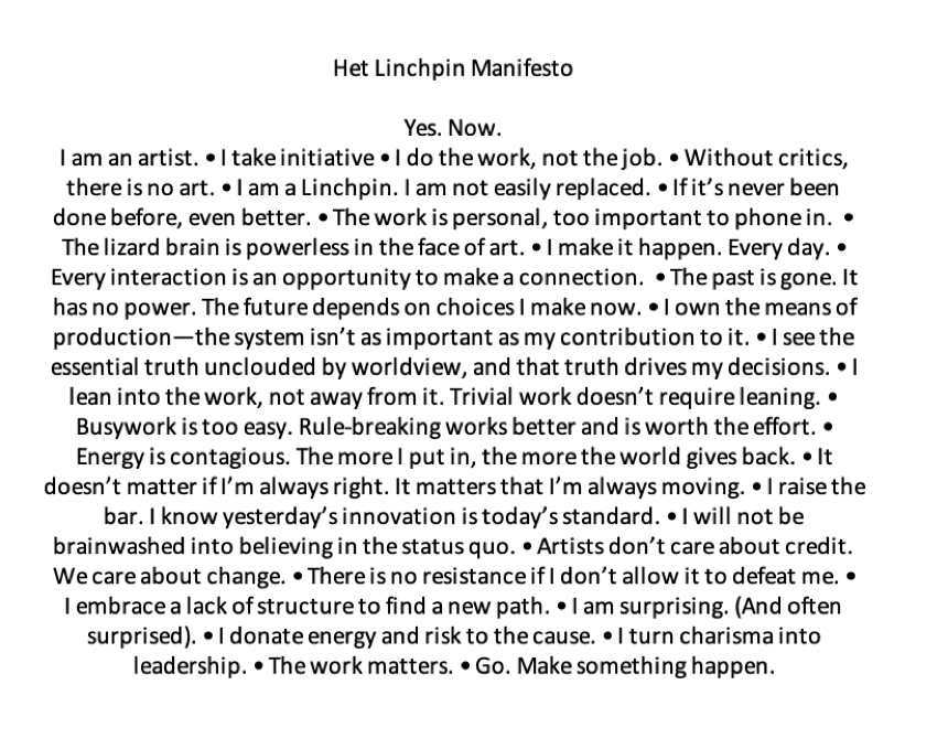 Een linchpin helpt om het voortrouw te nemen om mensen te verbinden in een organisatie op een actieve manier en met raffinament. Dit vraagt om emotioneel werk en hoe je dat moet doen, dat kan je niet vinden in een handboek.