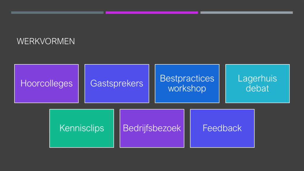 Zie voor de opbouw van de vier studiejaren de pagina hier.