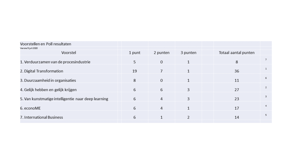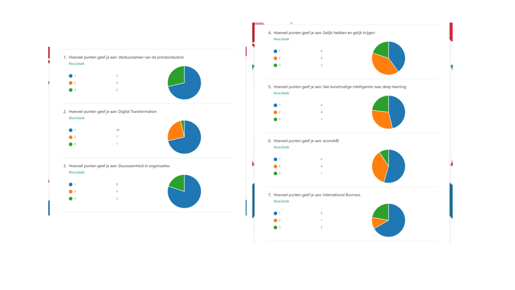 Die keuzevakken waren er nog niet, die worden eind van dit jaar ontwikkeld. En om een selectie te maken van welk vak er dan gegeven zou kunnen worden hebben docenten een serie voorstellen gemaakt. Die zijn gisteravond voorgelegd aan studenten van het 2e en 3e jaar. Het was een leuke interactieve sessie, hieronder de slides die gebruikt zijn en de uitslag. Deze uitslag wil nog niet zeggen dat die vakken ook gemaakt en gegeven zullen worden, het is ook een kwestie van budget.