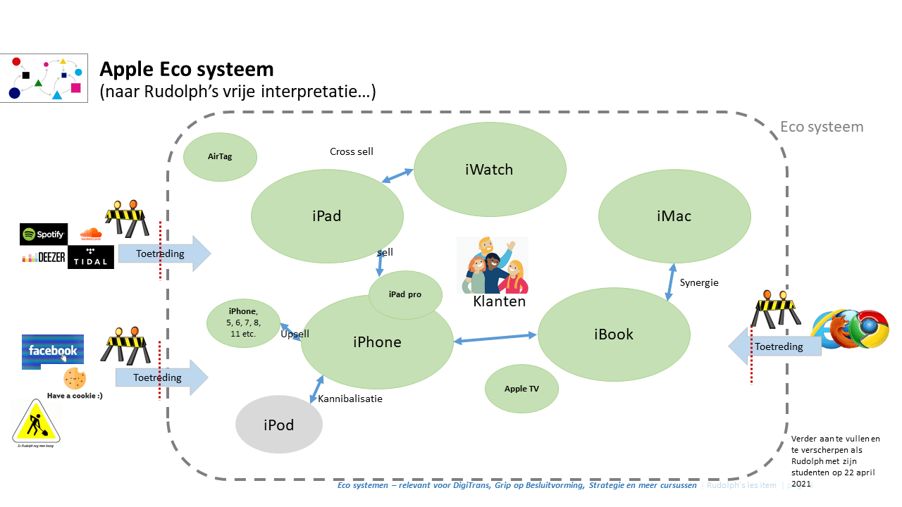 Over de marktmacht van wie de klant heeft. Je stapt als klant erin komt er moeilijk uit. Je wilt partner worden van, of toetreden tot, het Eco systeem. Je wil erin, dat lukt niet. Peter Drucker zei het, de enige reden van het bestaan van een firma is de klant. Sluit je die in dan blijf je bestaan. Hoe dat te doen? Met een Eco systeem.