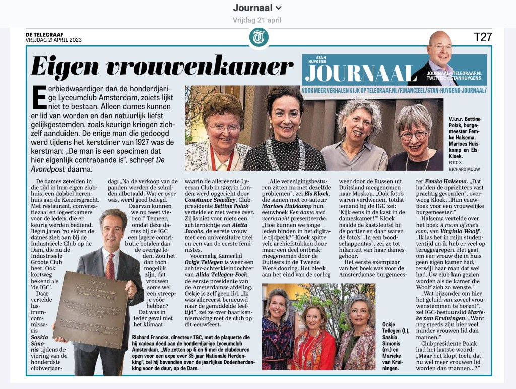 Men schrijft: ‘ De Club, die zich sinds 2013 ‘koninklijk’ mag noemen zit 100 jaar op op de Dam, in het pand Industria. De vereniging telt 1500 leden, veelal afkomstig uit de top van het bedrijfsleven of bijvoorbeeld de gemeentepolitiek. Leden moeten minimaal op hbo-niveau hebben gestudeerd of een zakelijke of maatschappelijke positie bekleden waarin een dusdanig niveau tot uitdrukking is gebracht,’ aldus de reglementen.