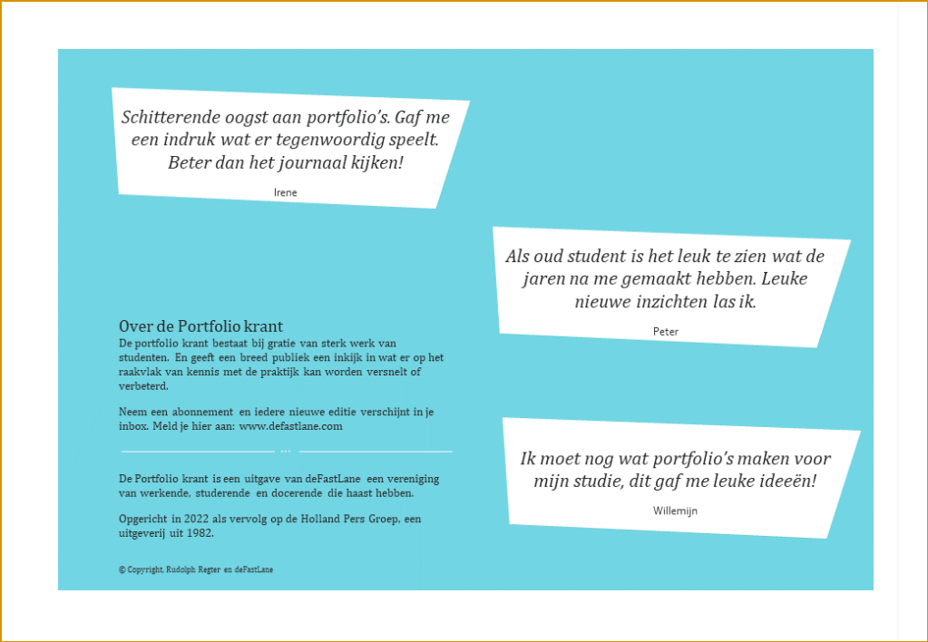 Hieronder de lente 2022 versie van de Portfolio krant. Een uitgave van de stichting deFastLane. Met bijdrages van oud en nieuw studenten. Definitieve versie eind juni 2022.