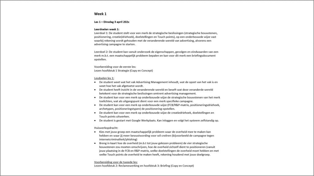 Hoe een beschrijving in een studiegids of lesplan eruit zou kunnen zien wat betreft de Leerdoelen.